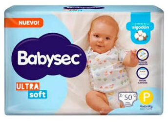 Pañales Babysec Ultra Soft, tamaño P, paquete de 50 unidades. Diseñados para ofrecer la máxima suavidad y confort para la piel del bebé. Con tecnología de absorción avanzada que mantiene seca la piel del pequeño, reduciendo el riesgo de irritaciones. Ajuste perfecto que evita fugas, proporcionando tranquilidad tanto para el bebé como para los padres.